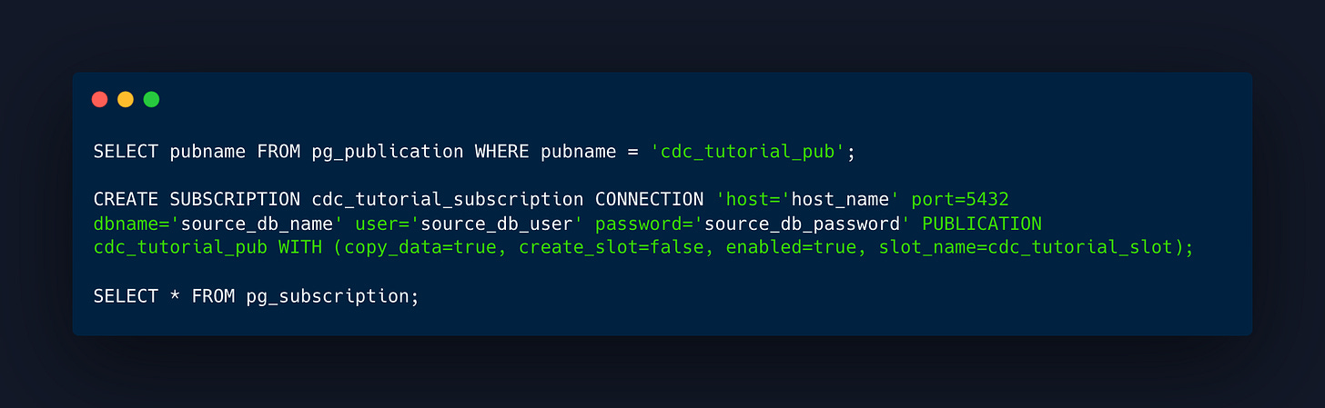 copy_data=falsewhen creating the subscription on the target database.This feature doesn’t replicate sequences, DDLs or schemas.