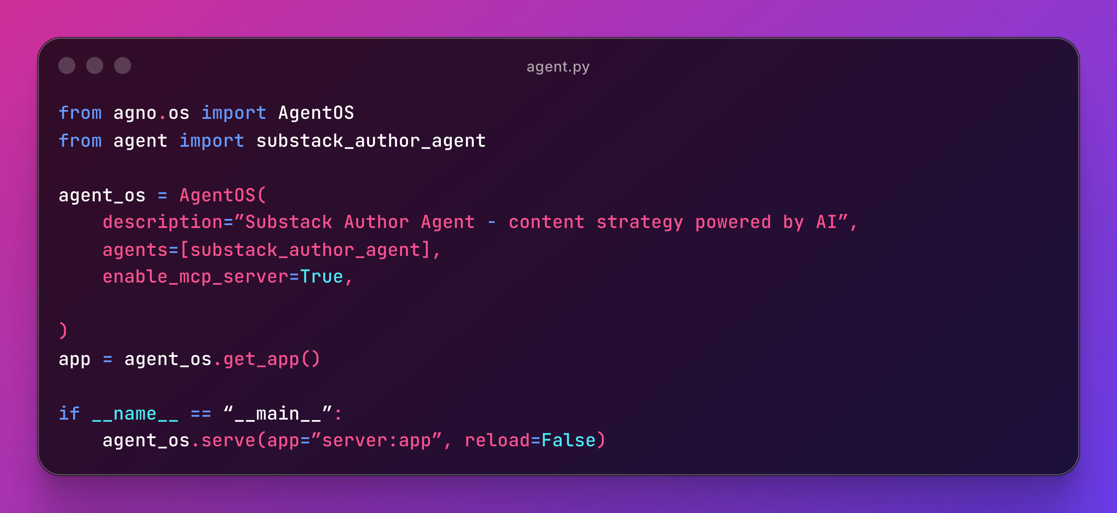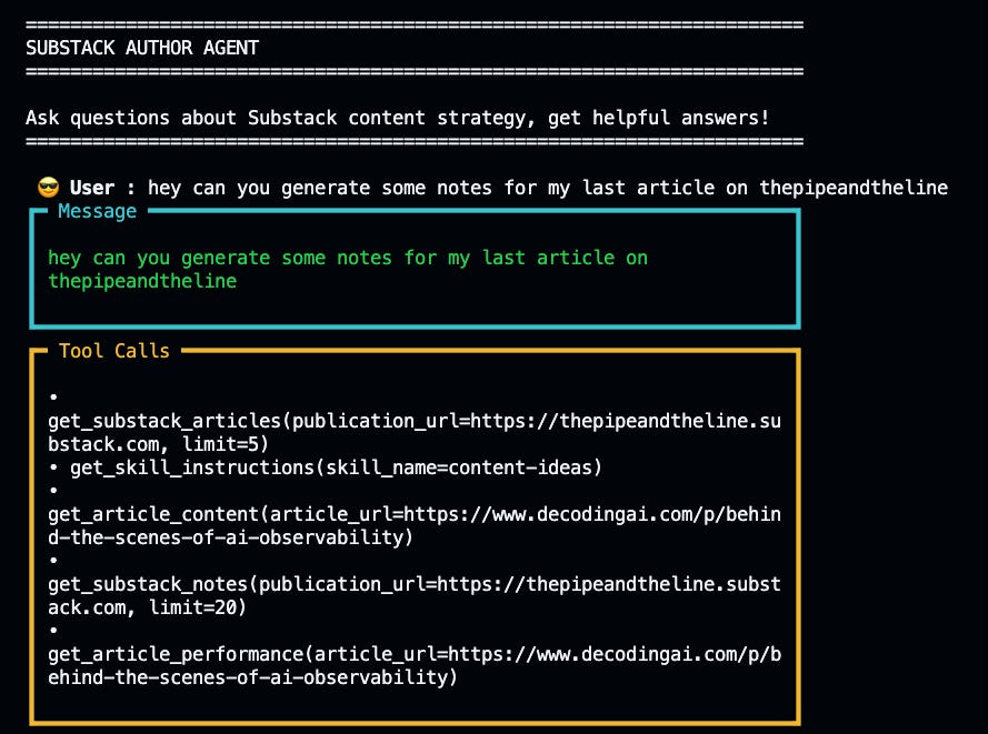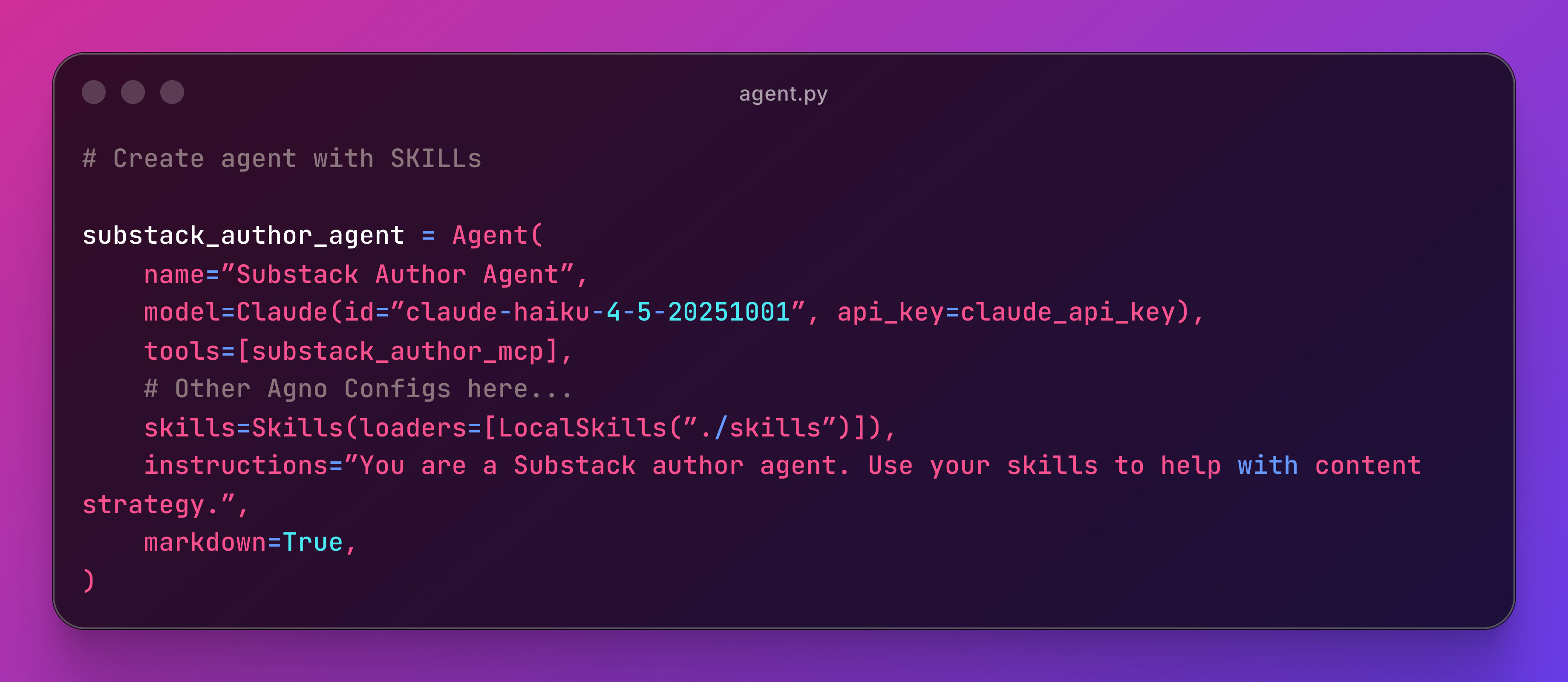 Built a Substack content strategy agent using Agno, Claude Haiku 4.5, remote MCP tools, and 5 SKILLs that load on demand.