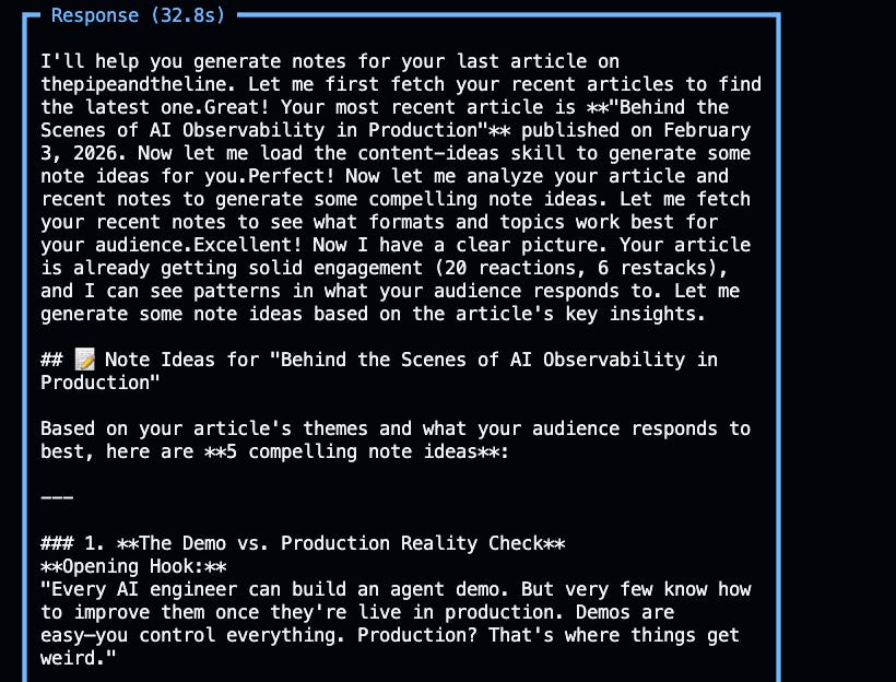 get_substack_notesto fetch notes” is better than “fetch the notes.”The system prompt becomes trivially simple. One line of identity. Everything else lives in skills. Compare this to the 1000-line system prompts I used to write.