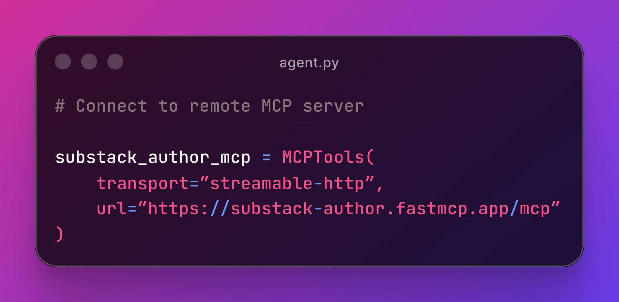 The agent connects to a deployed Substack Author MCP server, so no local setup for tools.