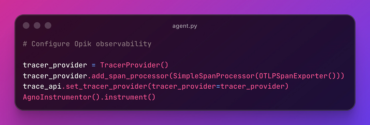 This snippet configures Agno to emit OpenTelemetry spans to Opik.