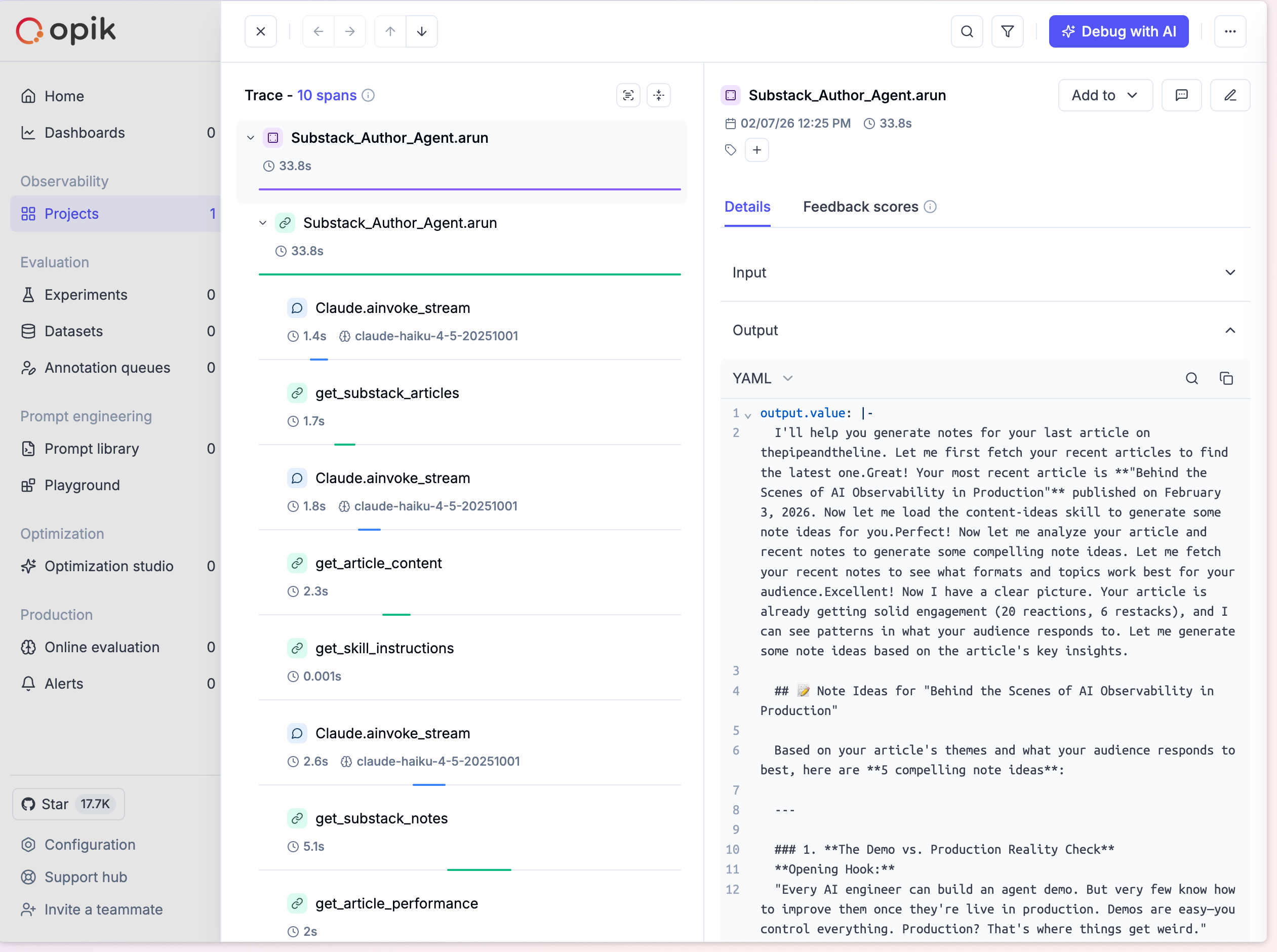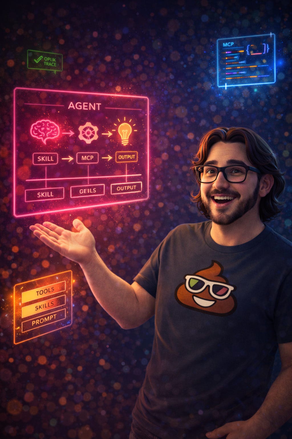 Opik + OpenTelemetry trace every run, tool call, and skill activation for observability.