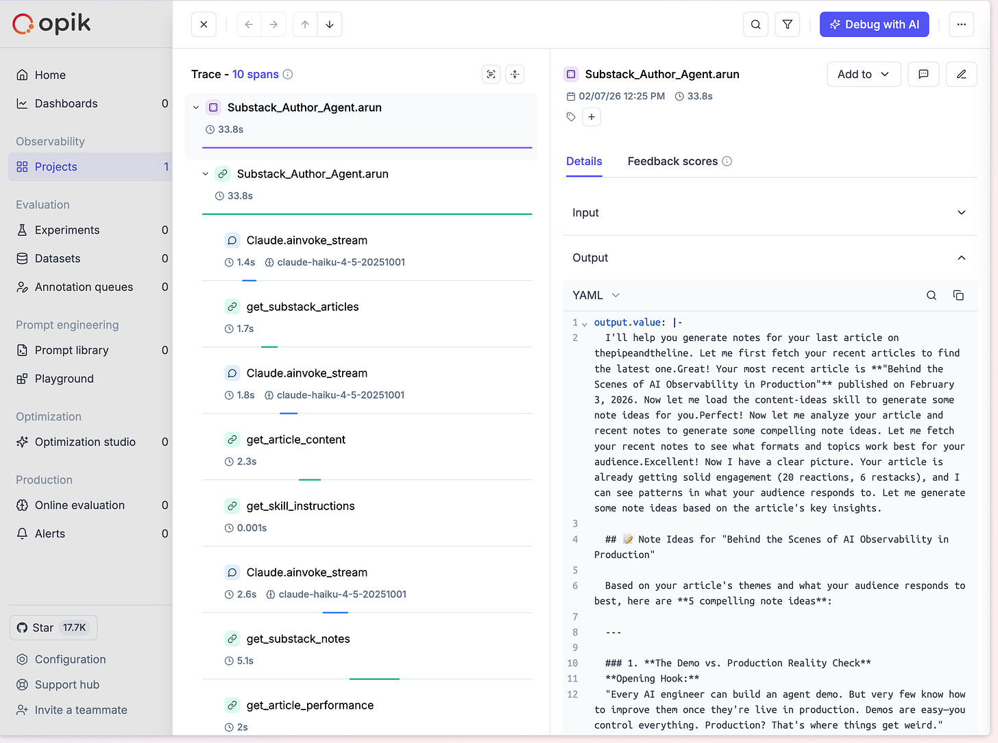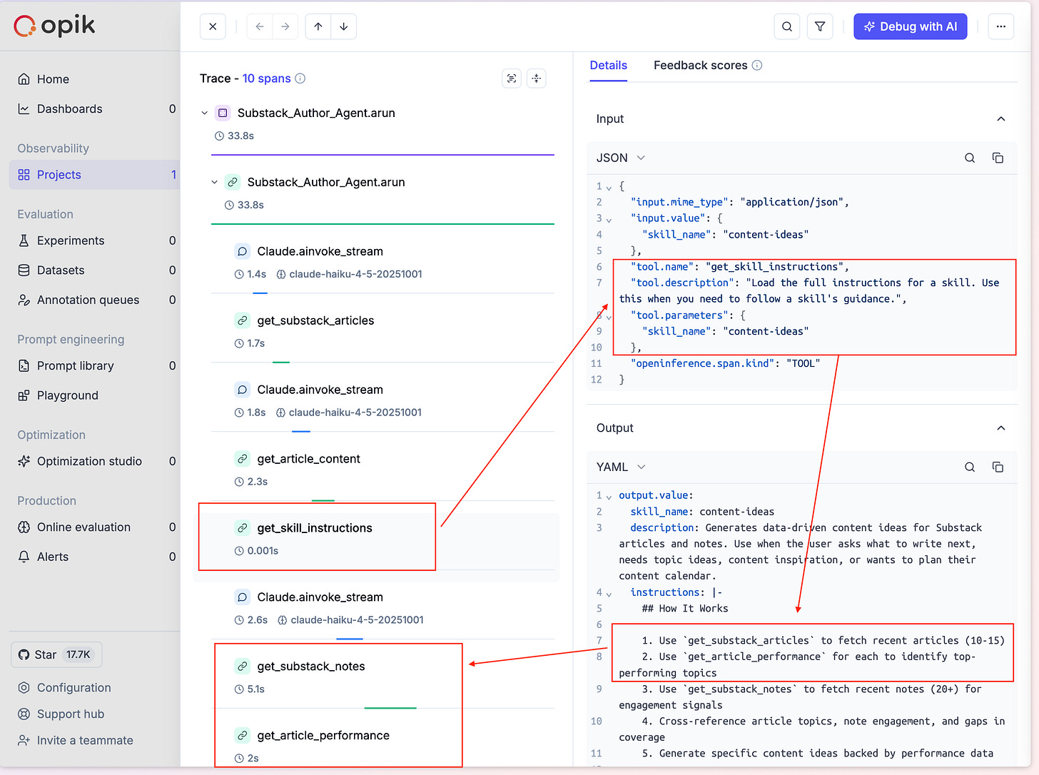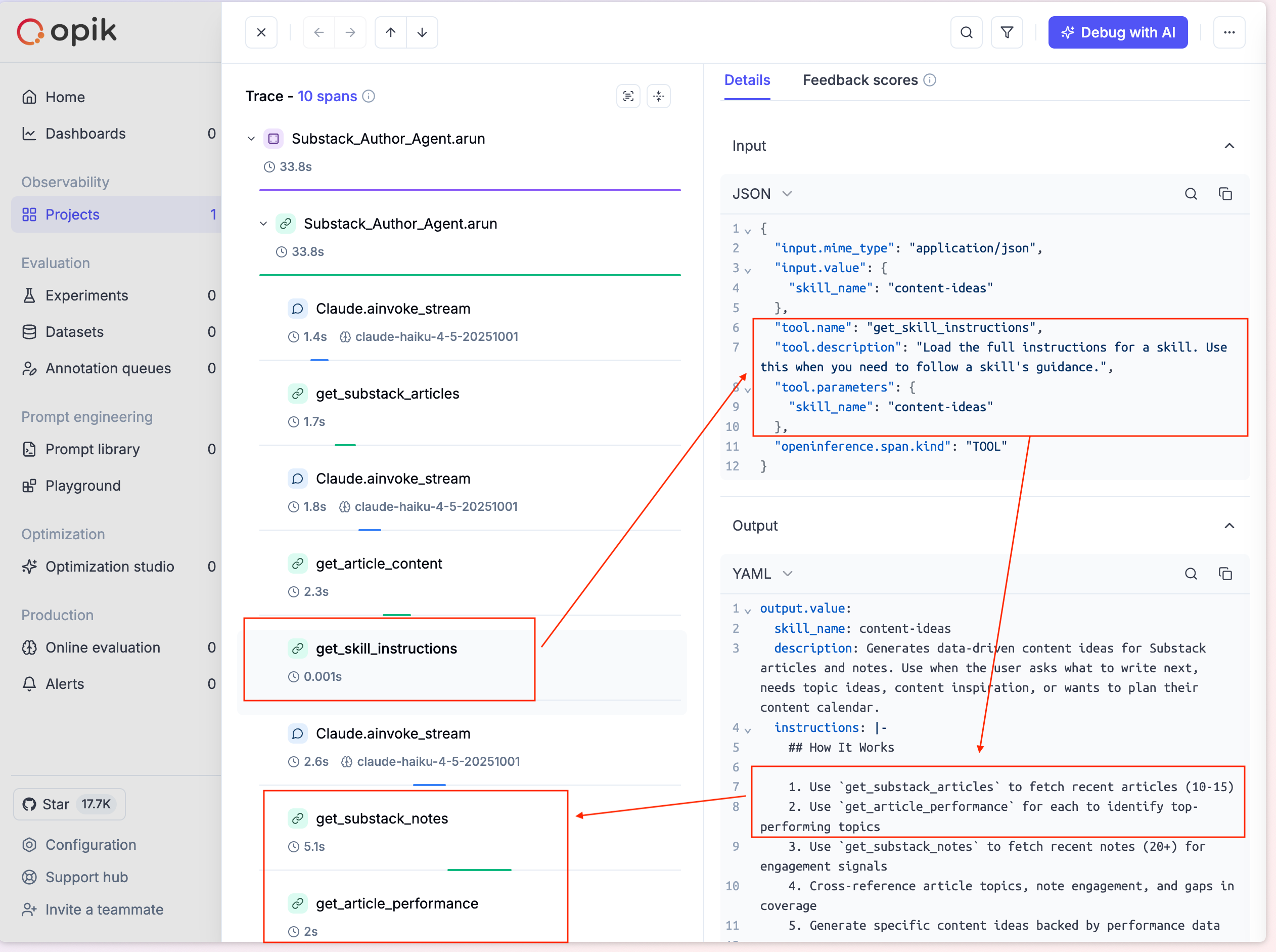Each conversation turn becomes a trace. Each tool call becomes a span. This matters when debugging: did the agent load the right skill? Did it call the right tools in the right order?