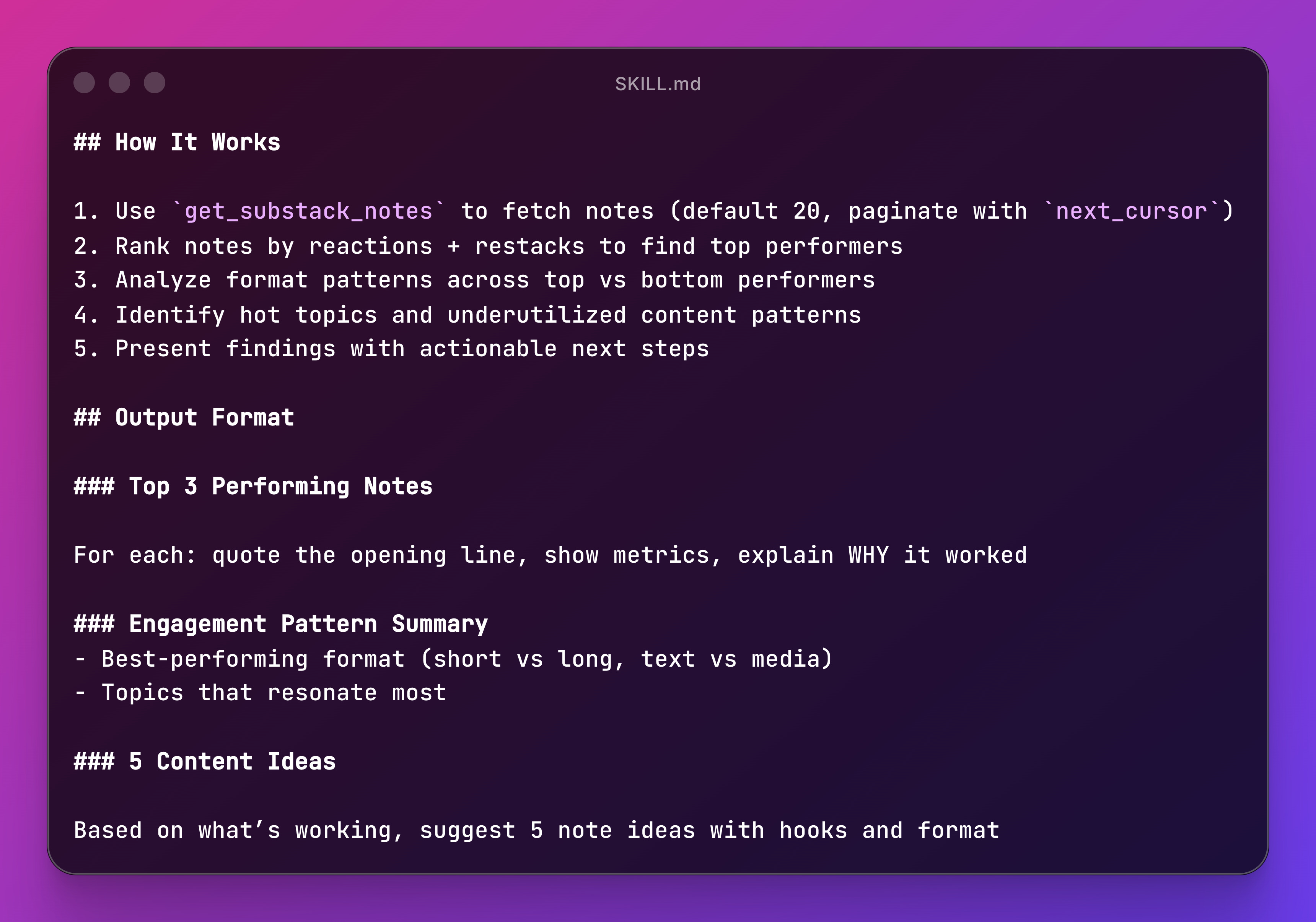 The skill says “fetch 20 notes using pagination, rank them by reactions + restacks, compare formats, and give me the top 3 with explanations.”