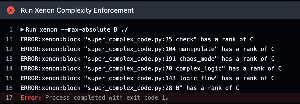 xenon --max-absolute B ./You can modify the complexity threshold for Xenon by changing the --max-absolute flag in your GitHub Actions workflow or when running it locally.