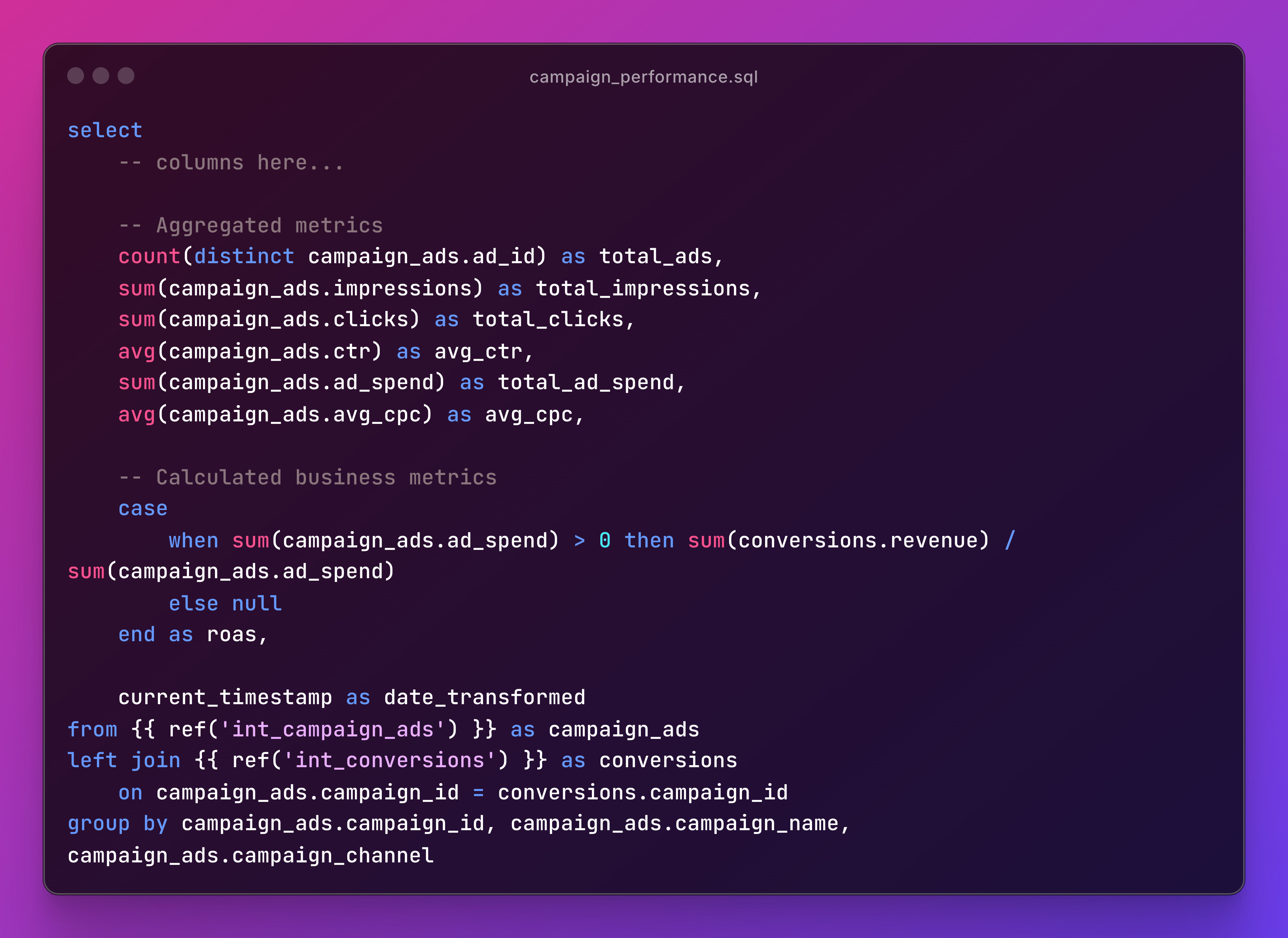 This is an example of flexibility and "not following the layers strictly". You can see aggregated metrics such as total_ads or total_clicks and roas calculation which could have been handled on the intermediate layer.