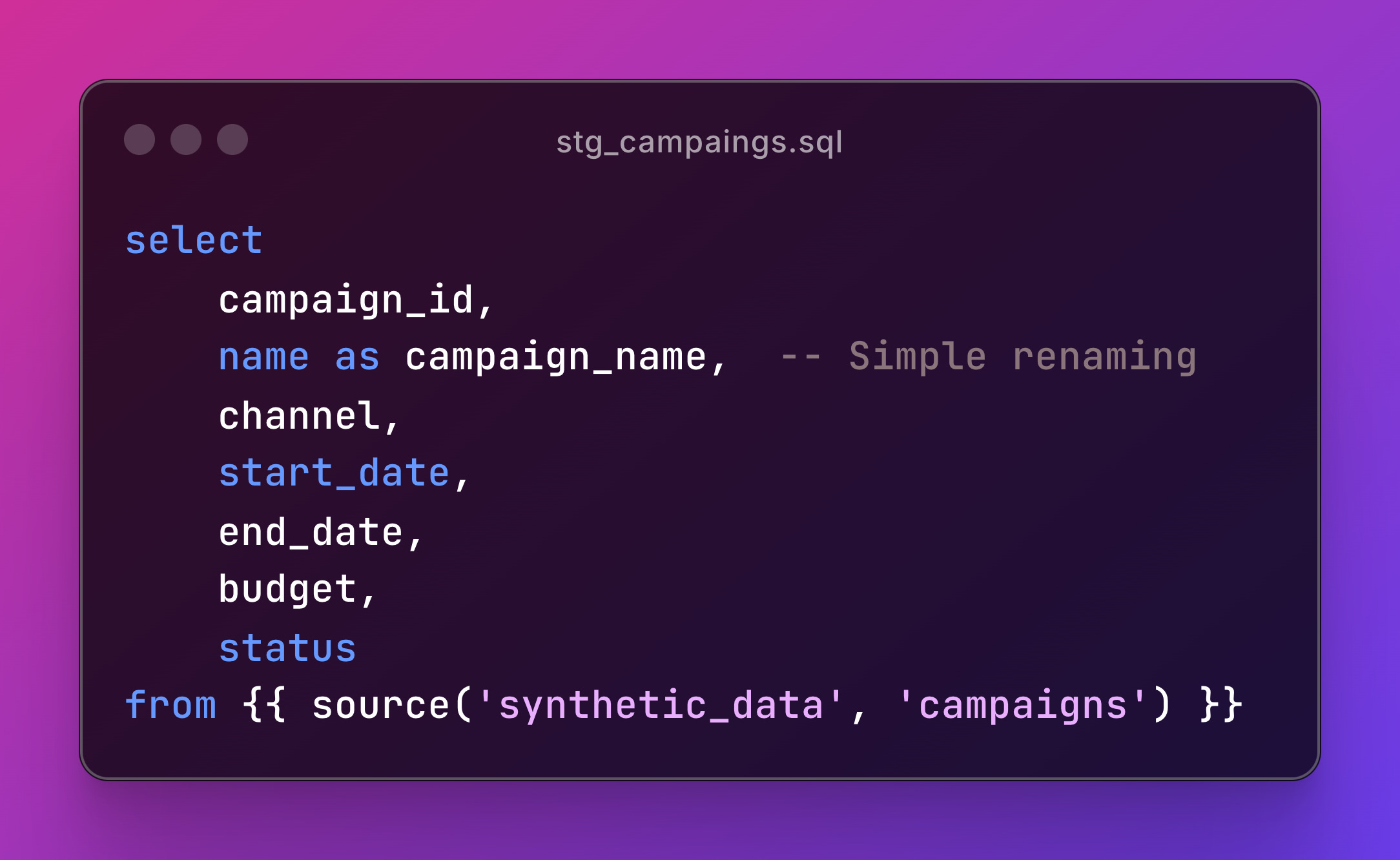 Notice whatās NOT here: no aggregations, no complex CASE statements, no joins. Staging models standardize column names, handle data types, and ensure consistency.