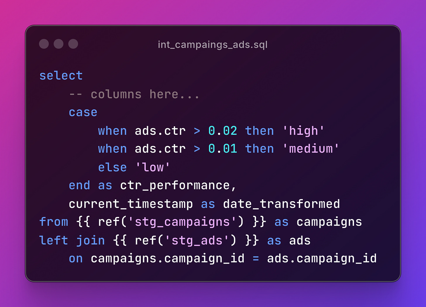 Intermediate models combine staging models with business rules. Look at int_campaign_ads.sql: