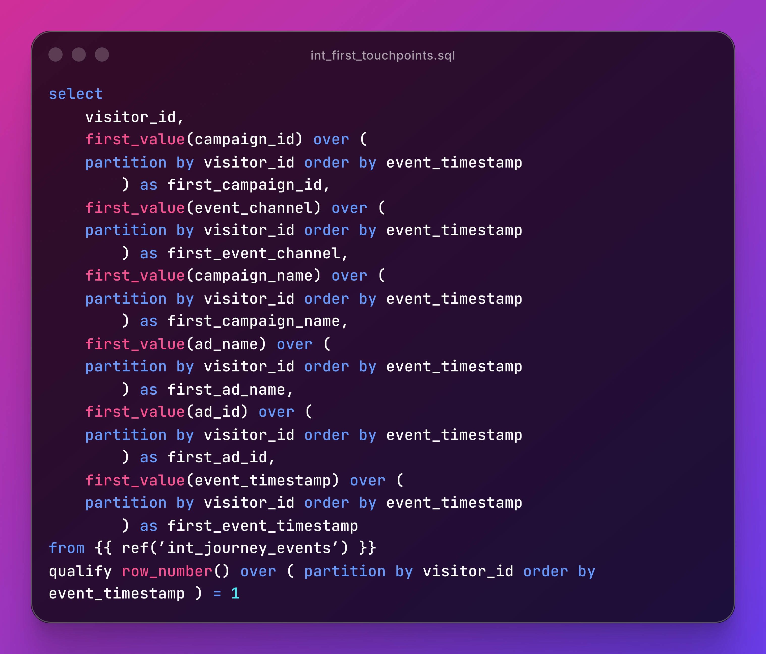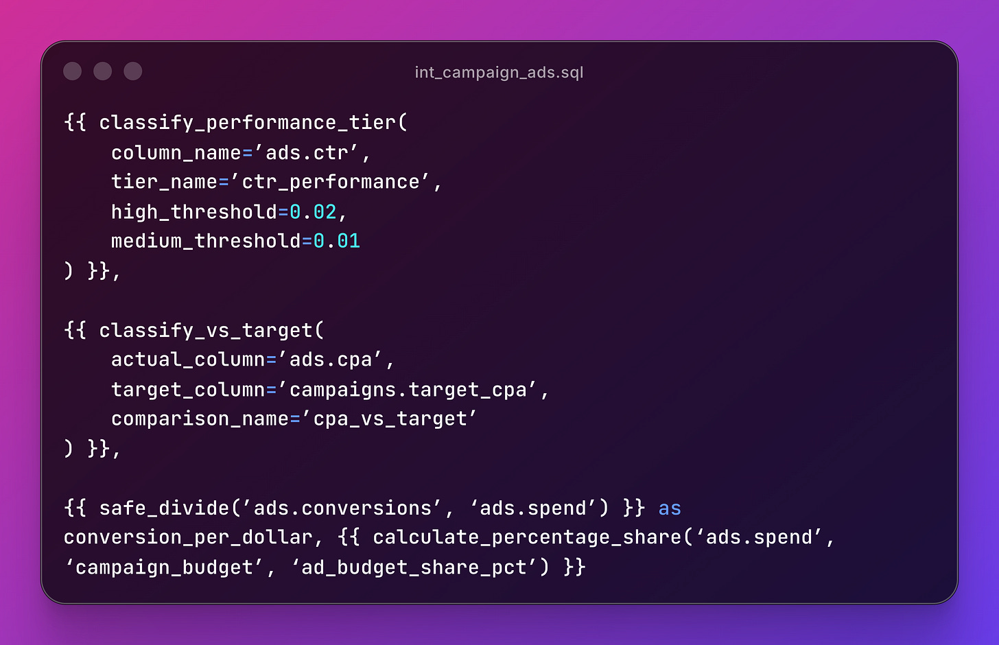 The projects has 4 macros but for simplicity we kept it lean. Here’s all four working together in int_campaign_ads.sql: