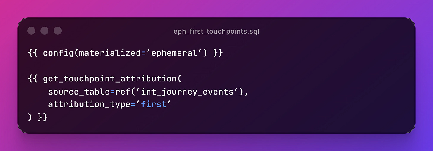 The repo keeps int_first_touchpoints.sql as a raw SQL view alongside `eph_first_touchpoints.sql`, which does the same thing with a macro. Side by side: