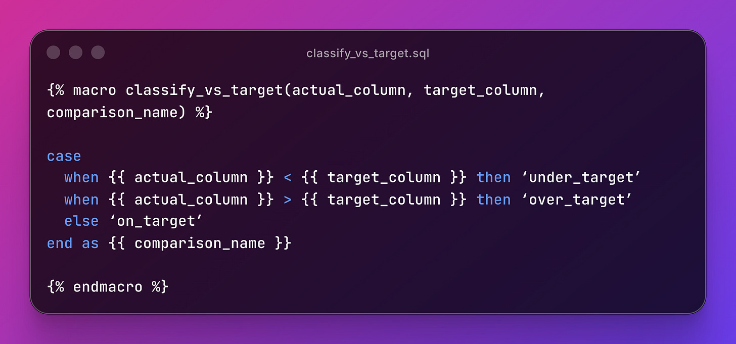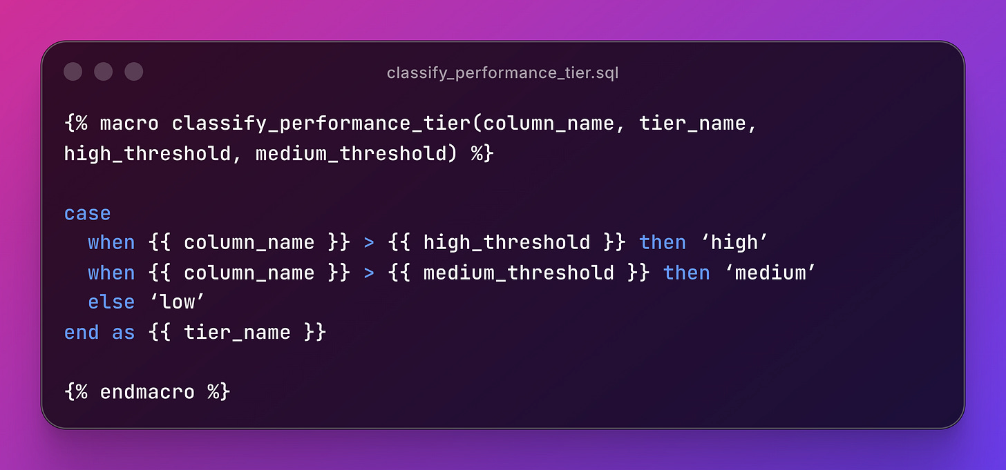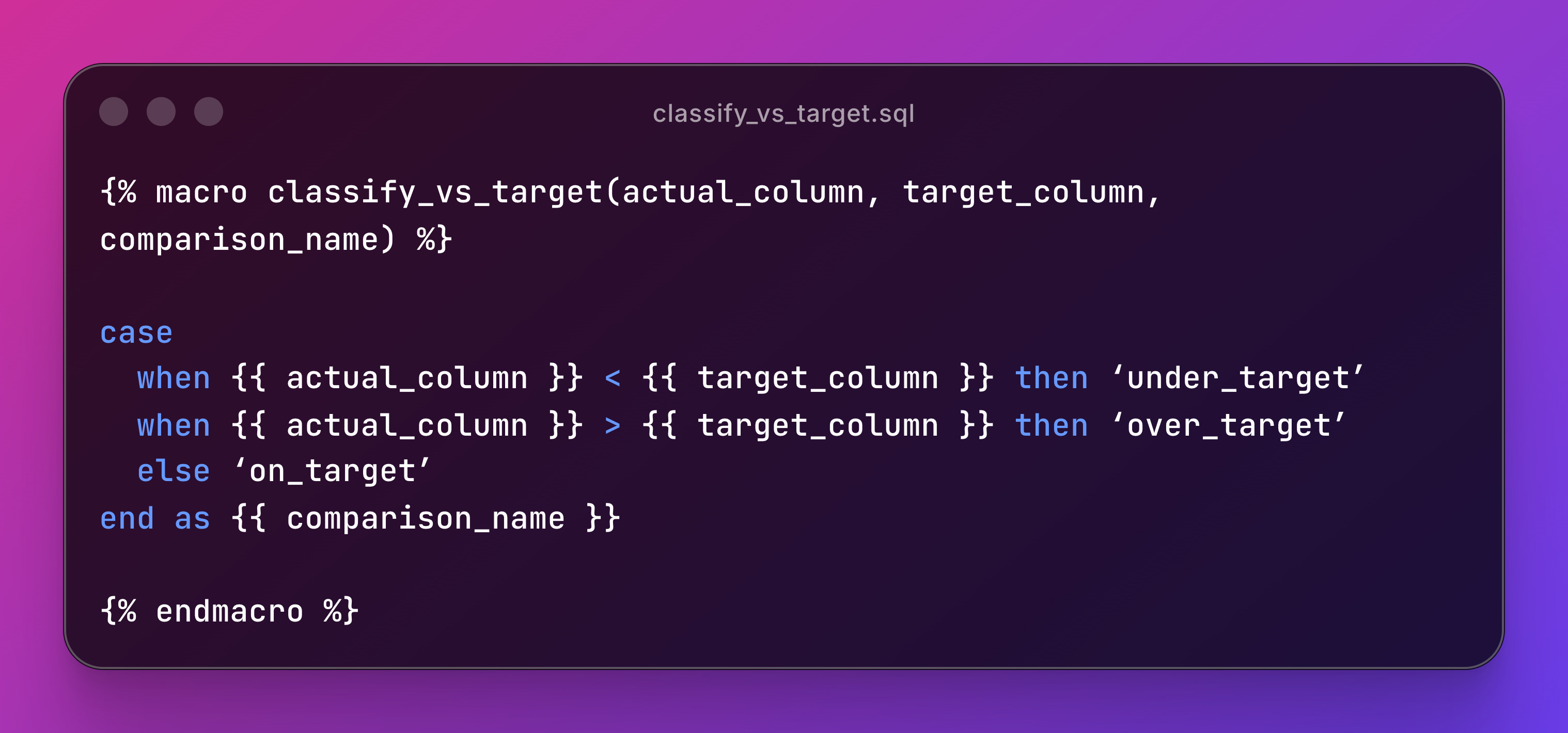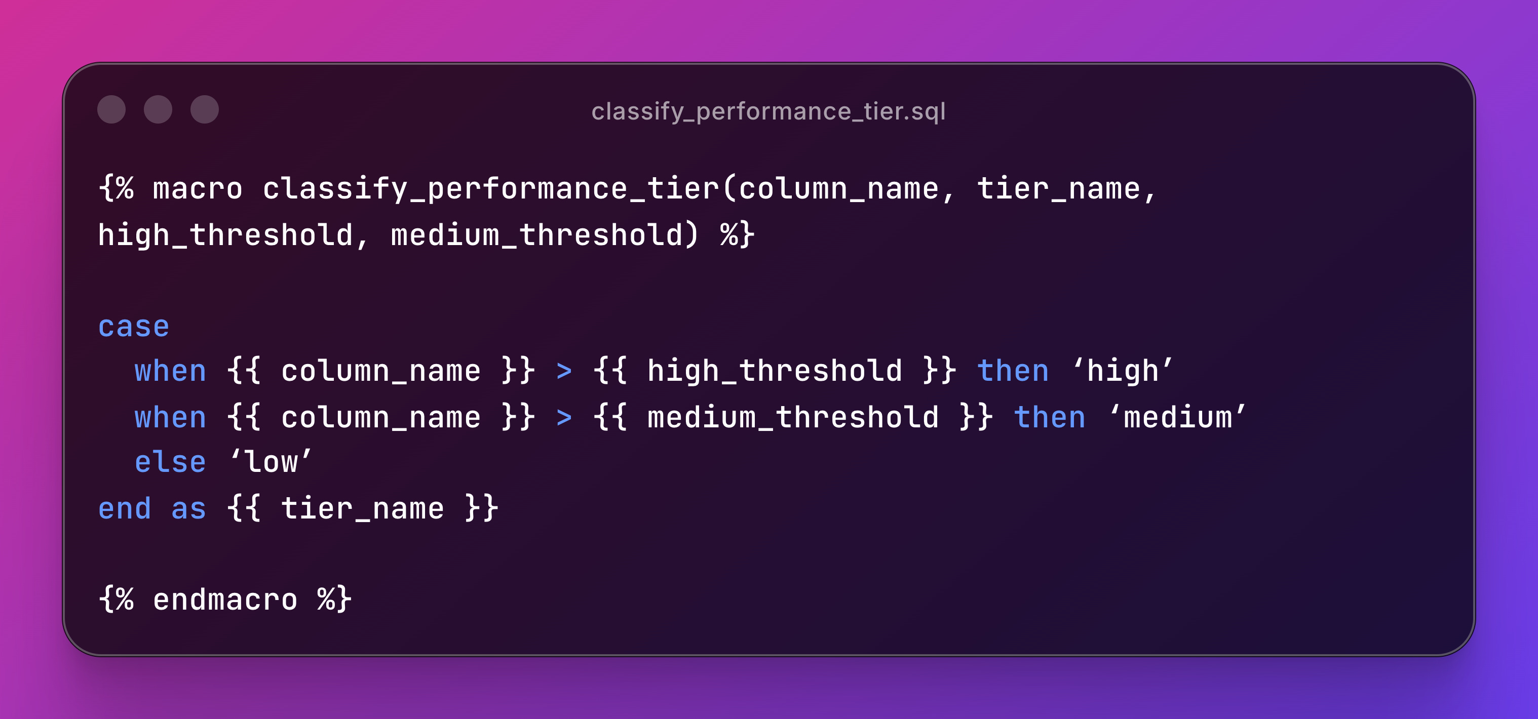 Macros encode business logic that should behave identically across models. They’re not a tool for eliminating every repeated line