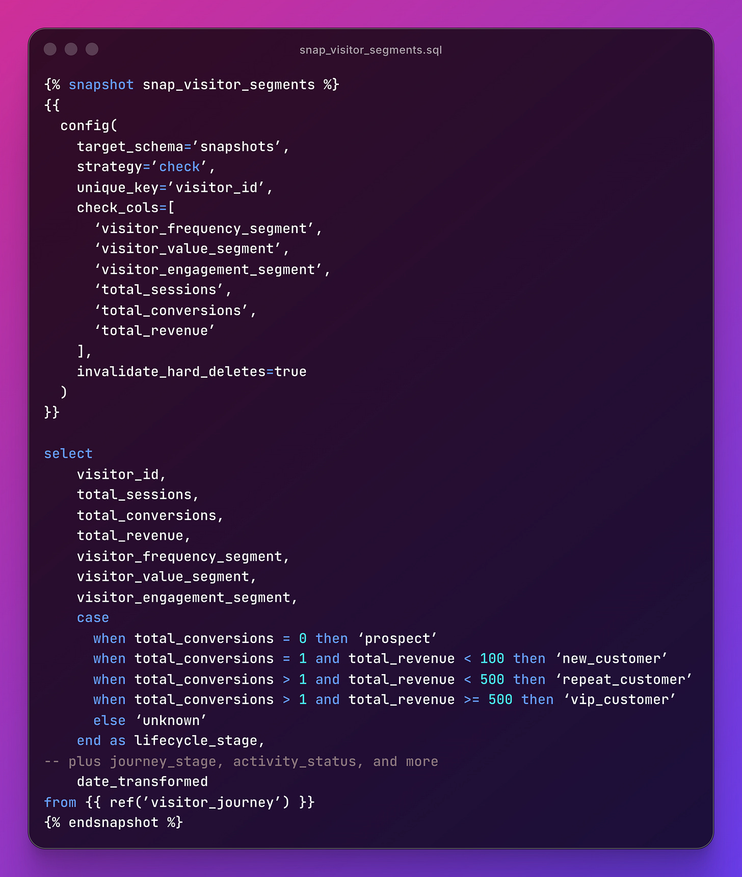 snap_visitor_segments.sql uses the check strategy. dbt only creates a new record when specific columns actually change: