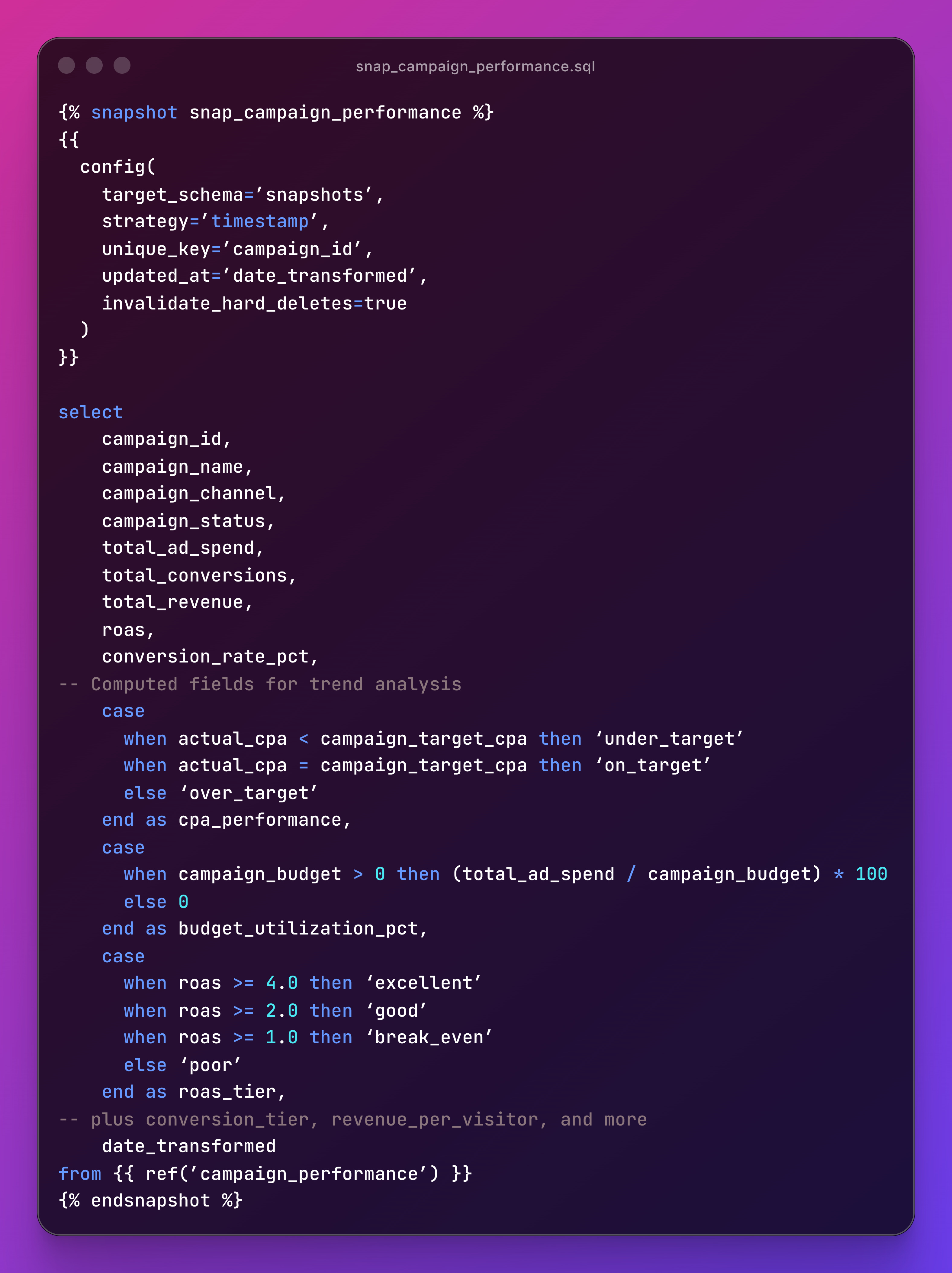 `snap_campaign_performance.sql` uses the timestamp strategy. Every time the source data updates, dbt captures a new historical record: